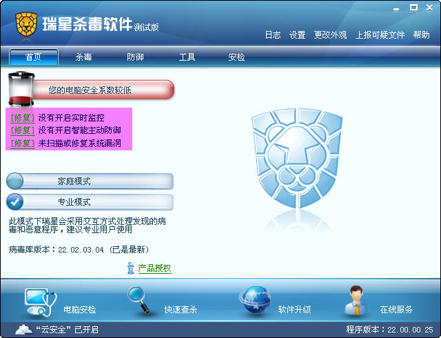 我们先来回顾一下第一阶段的瑞星2010杀毒软件界面。