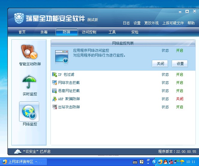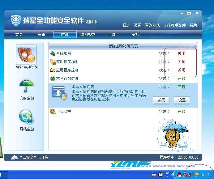 今天早上,进行瑞星全功能安全软件升级的时候,遇到了一件比较古怪的事情,升级之后,提示要重启,于是我立即按照提示进行操作,重启后发现,“系统加固”“应用程序加固”“应用程序控制”竟然给关闭了,另外,在“网络监控”选项中,“ARP诈骗防御”也给关闭,右下角的瑞星原来绿色雨伞标志也变成金黄色