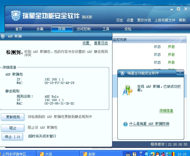 本人手动开启,“ARP诈骗防御”,电脑的喇叭马上传来类似“啾啾”的警告声,大概说是遇到,“ARP诈骗”