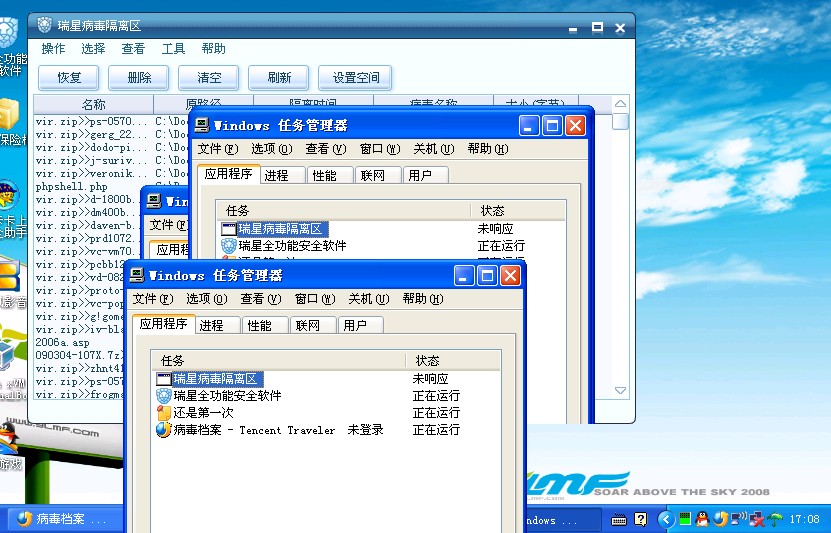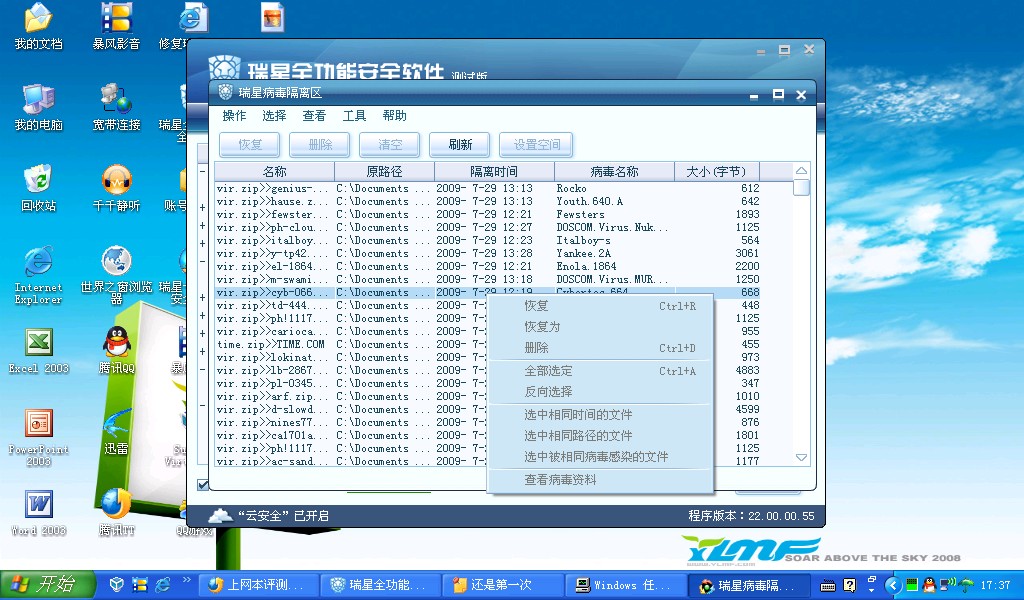 下午,没事情做,打开瑞星安全软件慢慢一项项仔细看,看到病毒隔离区的时候,发现一些问题,如图,“运行”病毒隔离区之后,发现里面包括清除的菜单不可选的(版本22.00.00.55)
