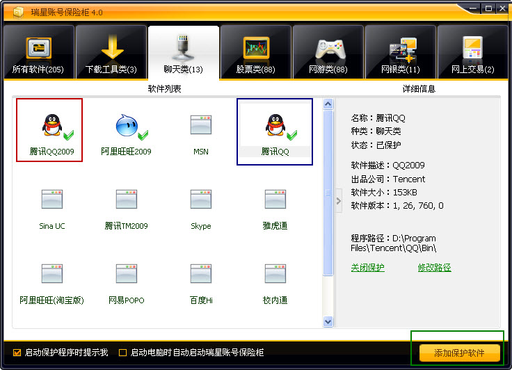 因为最开始保险柜不支持QQ2009,所我手动添加了一个,现在我的聊天类里面有两个QQ,想删除一个,但没有找到删除的位置,似乎并不支持删除功能。所以建议增加删除保护软件功能。