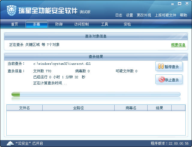 在上网本上运行杀毒功能,计算查杀时间持续将近2分钟,下面是在1分32秒的时候截的图。
