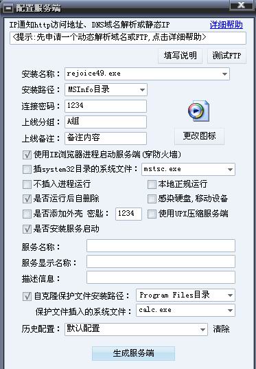 对于制作病毒的而言,一种病毒想免杀首先要做的是用特征库中没有的特征码,或者加花指令,或者加壳。效果好的就可以免于被杀软拦截,可以成功的在被感染者的电脑上安装,病毒不好的也就会在控制端上一上线就消失了,这就导致一个问题,如果病毒服务端成功安装后被清除,那病毒插入用来访问网络或保护的系统文件也会被当作病毒清除,不清楚的看图,这是灰鸽子的配置图
