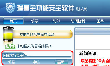 对于网络安全级别的设置,在瑞星全功能安全软件主界面中,用户可以直接进行选择。