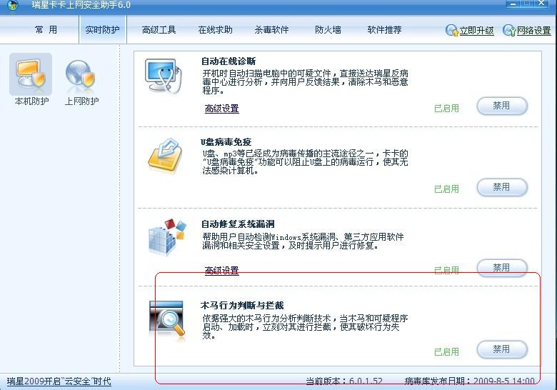 瑞星全功能安全软件的监控包括“网络监控和”“实时监控”,实时监控又包括了“文件监控”和“邮件监控”,卡卡上网助手有U盘免疫功能,无论病毒想通过各种途径入侵系统,是相当的不容易的!