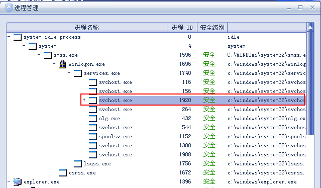 双击打开前面带有+的项目,比如这个svchost.exe。