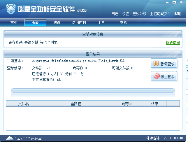 你好,前段时间安装了2010公测版杀毒软件,安装后其他功能均正常,每天可以不断地正常升级,但至今也没有实施全盘杀毒功能,点击杀毒后,可能扫描到1686个文件时就不动了,时间可能过了3个小时还在原来的位置,该问题已经反应给你们,后按你们的指示,进行磁盘清理后,依然如故。我就将该杀毒软件卸载后重新安装也是不行,之前反应的无法卸载问题已经解决,但还是无法扫描。重新安装后继续扫描,但还是无法正常扫描通过文件,我将卡住的那个nokia文件删除后,再行扫描就出现office文件通不过。这样我也不知道是哪些文件通不过呀,以前使用的09版的没有出现过这样的问题呀,请费心帮助解决下。