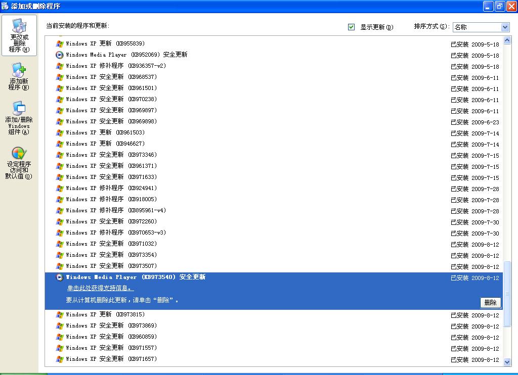 今天用卡卡6.0.1.54版本打了9个漏洞补丁,用卡卡重新扫描漏洞后,KB973540这个漏洞补丁依然存在,但是在“控制面板”的“添加或删除程序”里,却有该补丁的显示,如图。怎么回事啊?