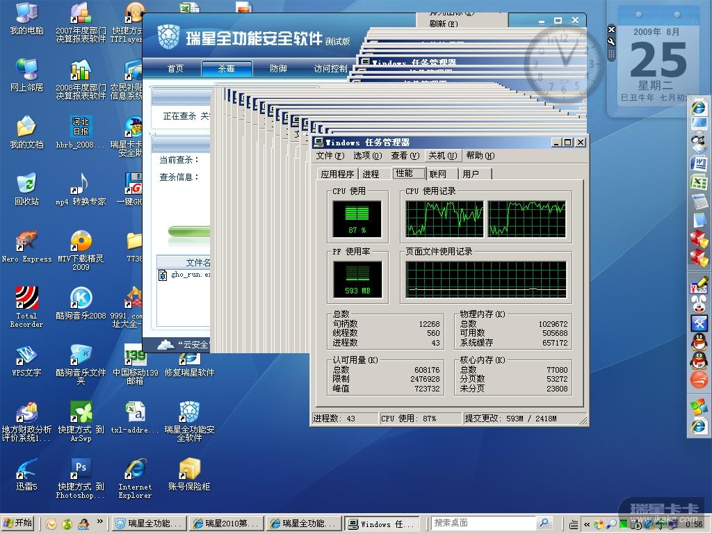 1G内存,运行了IE及诸多软件然后开杀软,在一开始杀毒会很卡的,然后再开任务管理器,恩,瞬间的cpu使用率上升,你的任务管理器只是拖影应该老天保佑了
