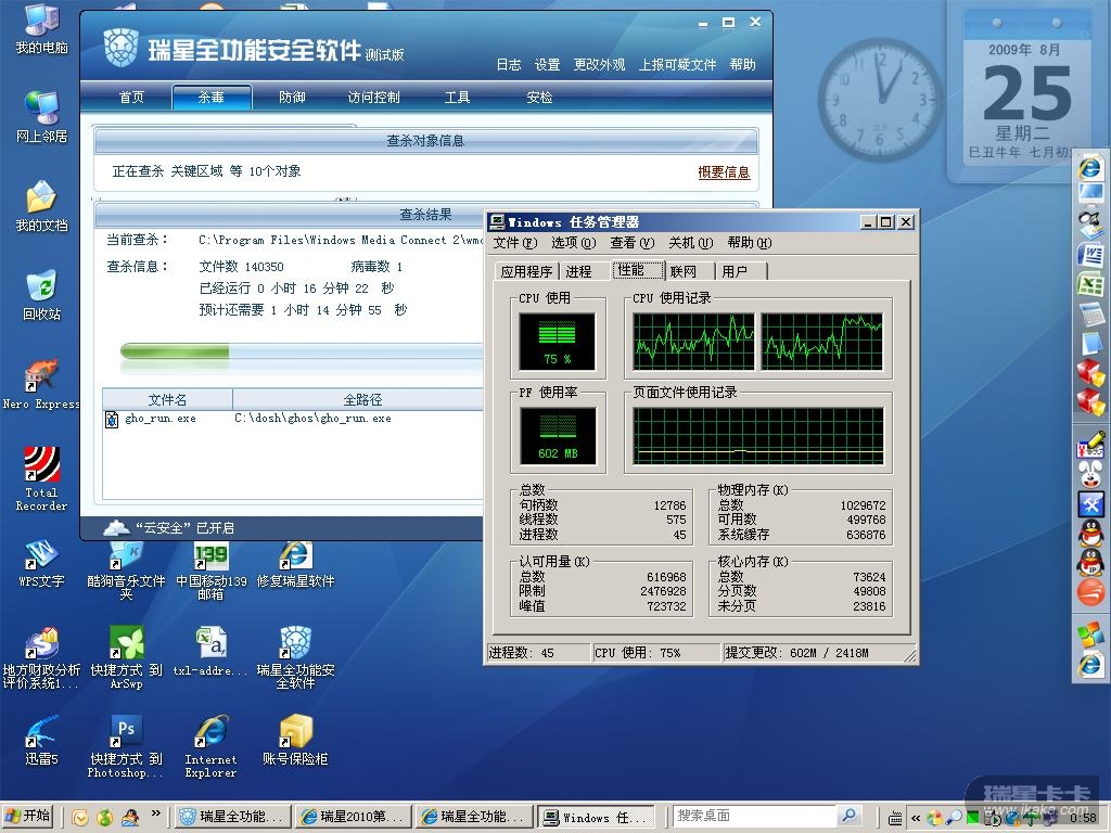 在打开软件进行全盘扫描过程中,点击杀毒后,打开概要信息时,软件运行变慢,CPU使用率增大,任务管理器显示瑞星未响应,时间持续几十秒,最短十几秒钟。如截图: