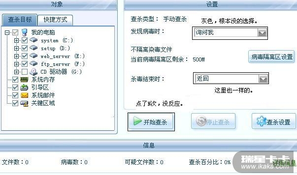 了。打开杀毒界面,按开始查杀,没点反应。而且设置那里也是灰色的,不能设置,在安全模式也不行,于是我