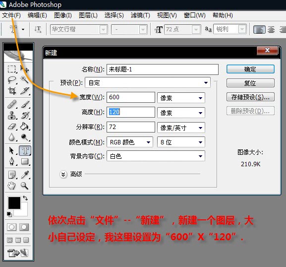 1、依次点击“文件”--“新建”,新建一个图层,大小自己设定,这里设置为“600”X“120”.
