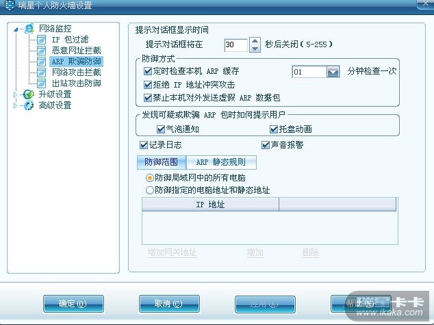 拜托,要把ARP欺骗防御里的拒绝IP冲突攻击打上钩,然后把禁止本机对外发送虚假ARP数据包也打上钩才行.