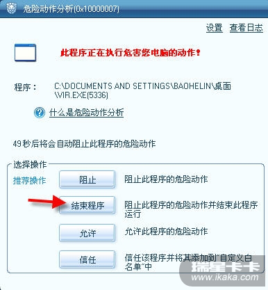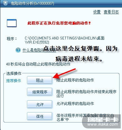 不要点击下图所示按钮(仅阻止病毒的动作而不结束其进程):