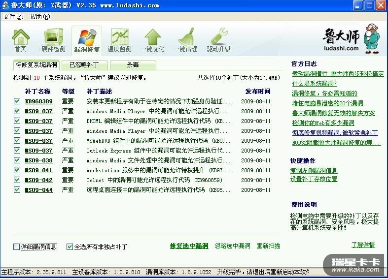 应该把卡卡也集成到杀软里或者将来的2010正式组合版里,不然还得另外安装卡卡岂不是太麻烦了,当然卡卡还是应该单独免费提供给广大用户,让大家多点选择嘛。不怕不识货,就怕货比货!我没试过用卡卡打系统漏洞补丁不知道效果怎么样,不过我认为用z武器(现在叫鲁大师)打补丁不会遗漏速度也非常快,可能人家在下载补丁文件的时候是采用类似迅雷的技术,比360安全卫士吹嘘的此项功能强得多!