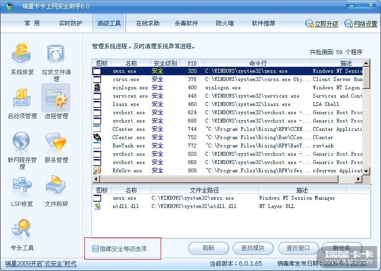 我的卡卡中的进程管理栏目中没有任何进程文件,重新扫描过还是这样(空白显示)。我查了毒,没有毒。重新安装卡卡,还是这样。