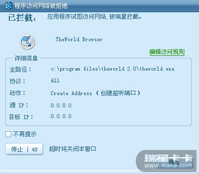 先把世界之窗在访问控制中加为“禁止”,再访问网络,显示如下