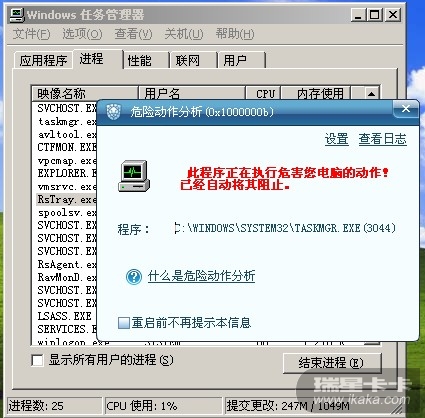并且无论是切换到专家模式、交易模式都是如此。也就是说,从现在开始,瑞星RIS全功能软件的防火墙功能,除了能拦截ADSL时的包以外,基本上默认是关闭的,无效的。 在这里,我得爆发一下了。 1、我在虚拟机的情况下,用任务管理器关机、注销、重启会提示: