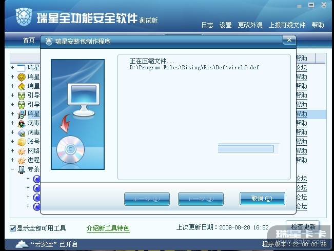 问题现象:在使用“瑞星安装包制作程序”时,如果到最后(如图)时再点取消,“瑞就安装包制作程序”就会出现程序停滞,无法取消,同时安装包不会被清除。