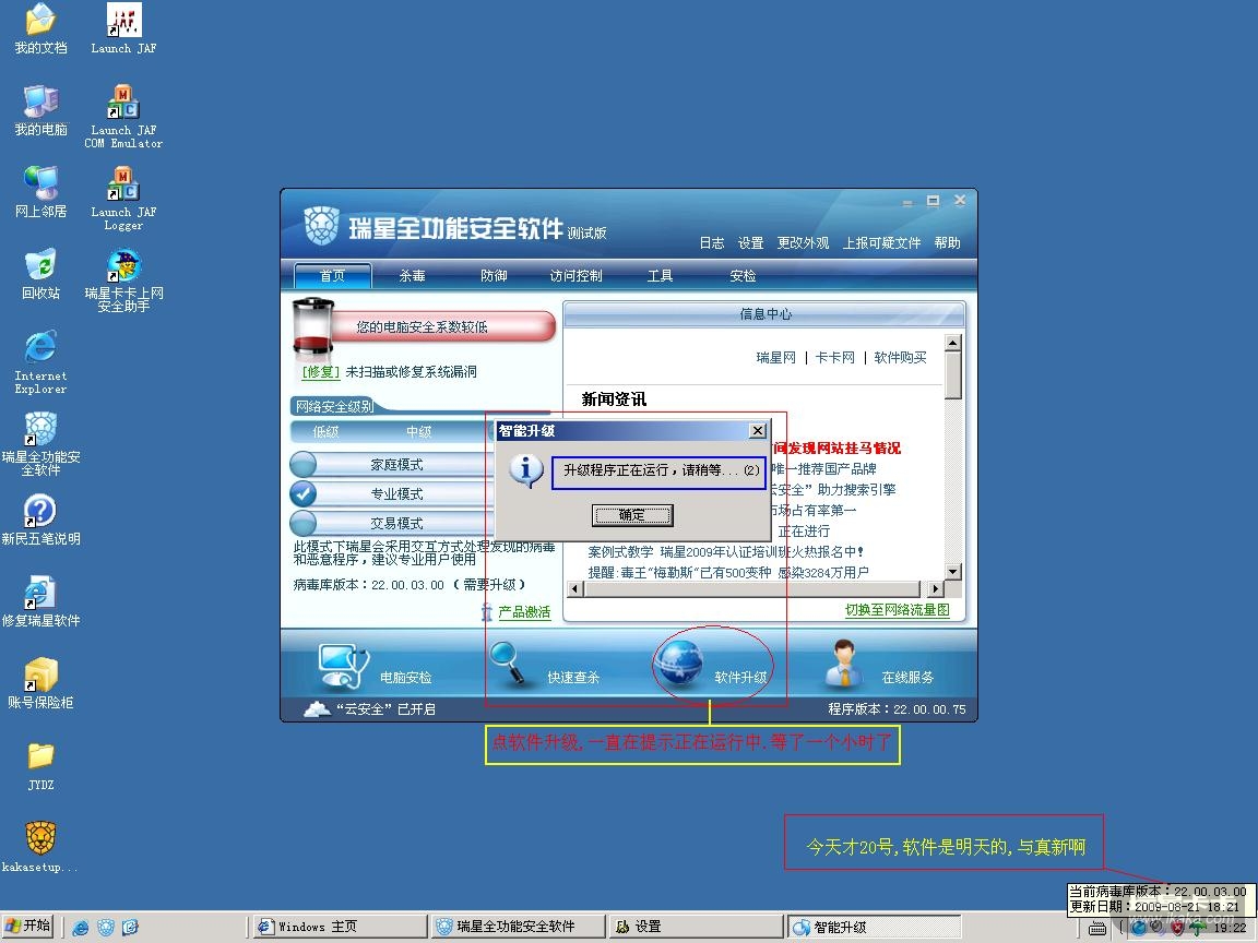 如果楼主想手动升级,建议将瑞星不要设置为即时升级模式,查看是否正常