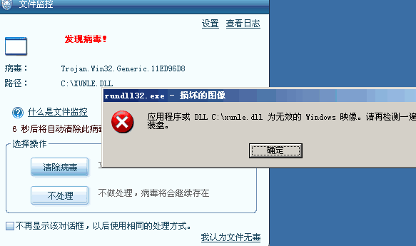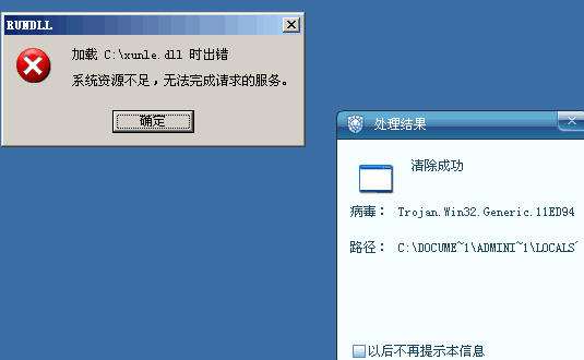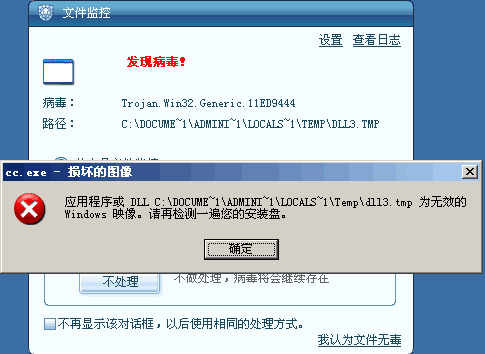 紧接着瑞星弹出文件监控发现病毒的提示,从以下几张截图可以看出,虽然cc.exe过了瑞星,但是它释放出的文件被杀毒软件识别并杀掉,cc.exe这个下载器病毒的主要破坏功能是由释放出的文件来完成的,随着释放文件被歼灭,杀毒软件也直接将cc.exe进程直接结束了,瑞星多维、立体式的主动防御拦截成功。