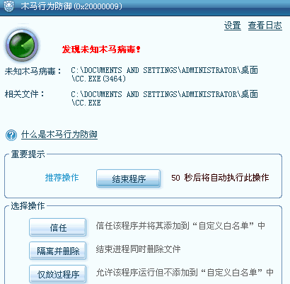 木马行为防御出马,按照提示的推荐操作“隔离并删除”,cc.exe直接被灭掉,再次拦截成功;