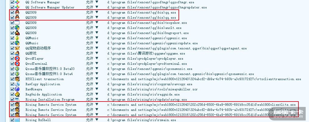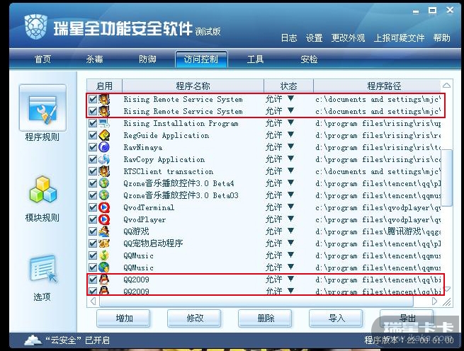 问题现象:打开瑞星主界面--访问控制--程序规则下,程序名称中有很多一样的程序,如QQ2009等,同一个软件同一个目录,却有2个程序,点“清除无效规则”也没有用,不知是否正常。(如果设置两个状态,其中一个就是无效的)如图: