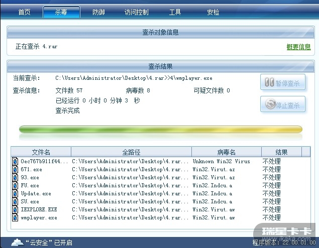 瑞星软件版本:程序版本22.00.01.00  病毒库版本22.14.00.11