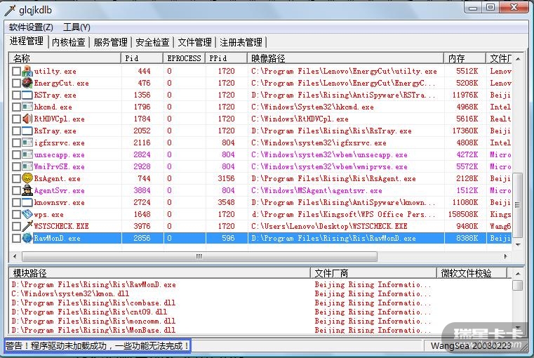 为何WSYSCHECK 在未加载驱动的情况下结束瑞星的进程呢???