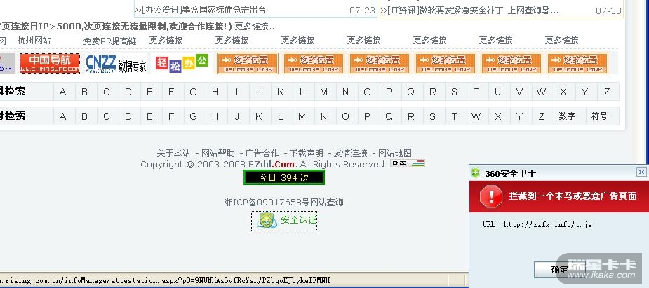 你的网站的确是被挂马了,所挂代码是通过搜索页面访问才回触发,如果直接访问是不会触发恶意链接地址,如通过google或雅虎的搜索引擎才会触发恶意链接地址。