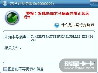 首先进入了启动所在的文件夹,然后建立快捷方式,浏览文件目录时候,只要选择系统所在文件夹,瑞星就会提示发现未知木马并阻止运行。