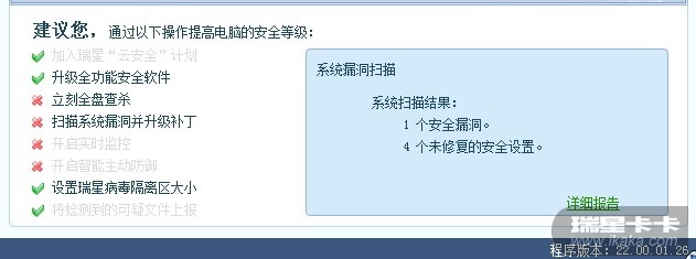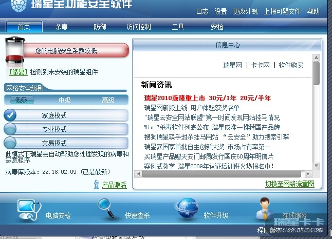 今天一开机 首先是瑞星的小伞变成红色  接着我就打开瑞星  就发生下图所发生的事情  智能监控打不开  主动防御打不开 安检结果为红色最底层 本人就立即了升级  还有一个问题 我桌面为什么没有快捷方式 连回收站都没了 可 桌面文档却显示有这些文件...  我按照瑞星网站的方法试过 删除  运行→的%temp%...在重新修复 (在这之前我用比斯图和avast!扫描过一遍 没什么异常) 修复后 本人再注销了一遍  发现瑞星的防火墙在右上角 而不是左上角  (我想应该是升级后的结果)  虽然工具栏的小伞变回绿色 但我进入瑞星全功能软件想去打开智能防御 却打不开....