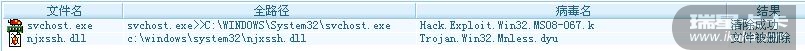 我的电脑每次杀毒都会有那两个病毒(每次杀完了都显示已清除,但重启后再查又会有这两个病毒),这到底是怎么回事呢,麻烦高手帮我看看这两个是什么病毒,如何才能彻底的清除干净,谢谢了!
