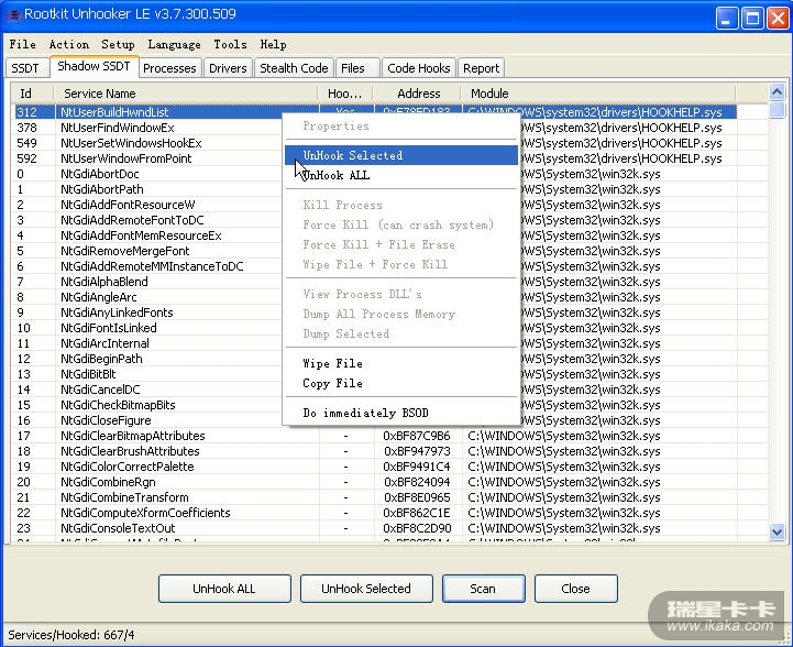 另外 可能存在刚开机的时候没有这个钩子的问题 如果没有这个钩子 请参考http://bbs.ikaka.com/showtopic-8673335.aspx然后右键选中这个函数 在右键菜单中选择"unhook selected"