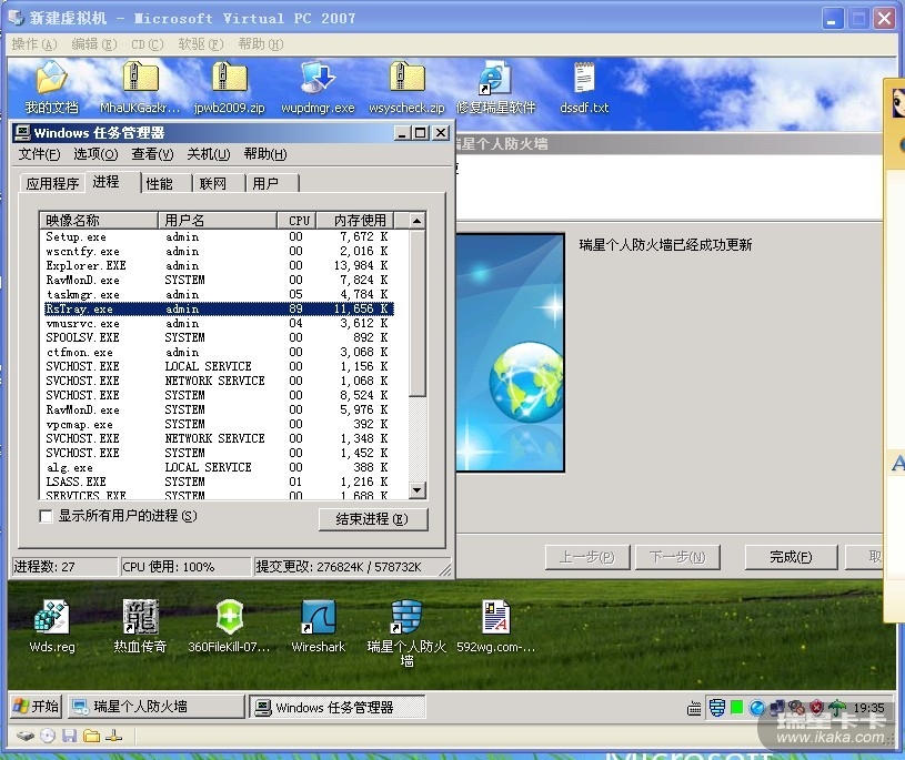 操作:升级瑞星防火墙,然后比较卡,发现防火墙的RSTRAY.exe进程占用了98~99%CPU。