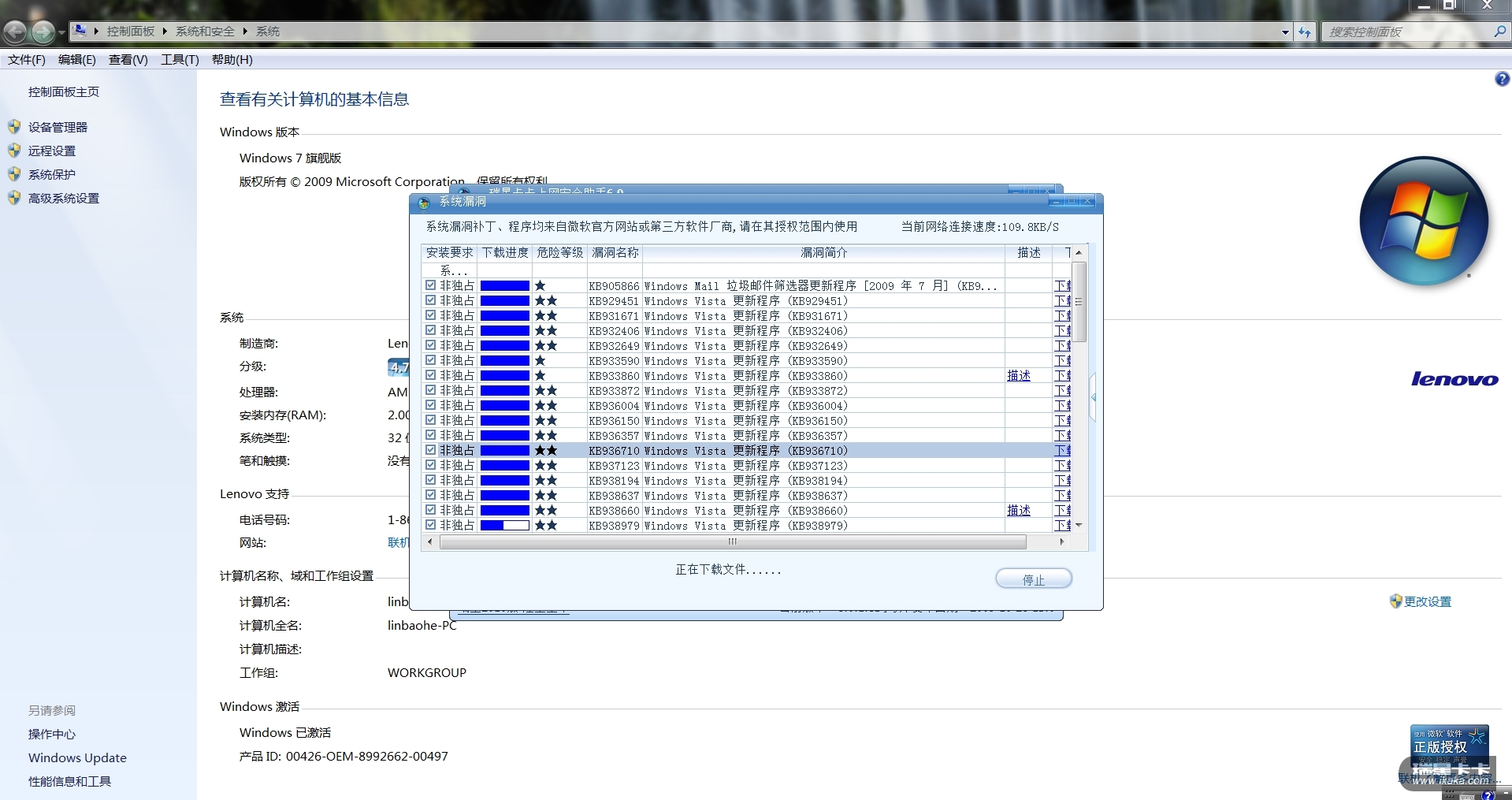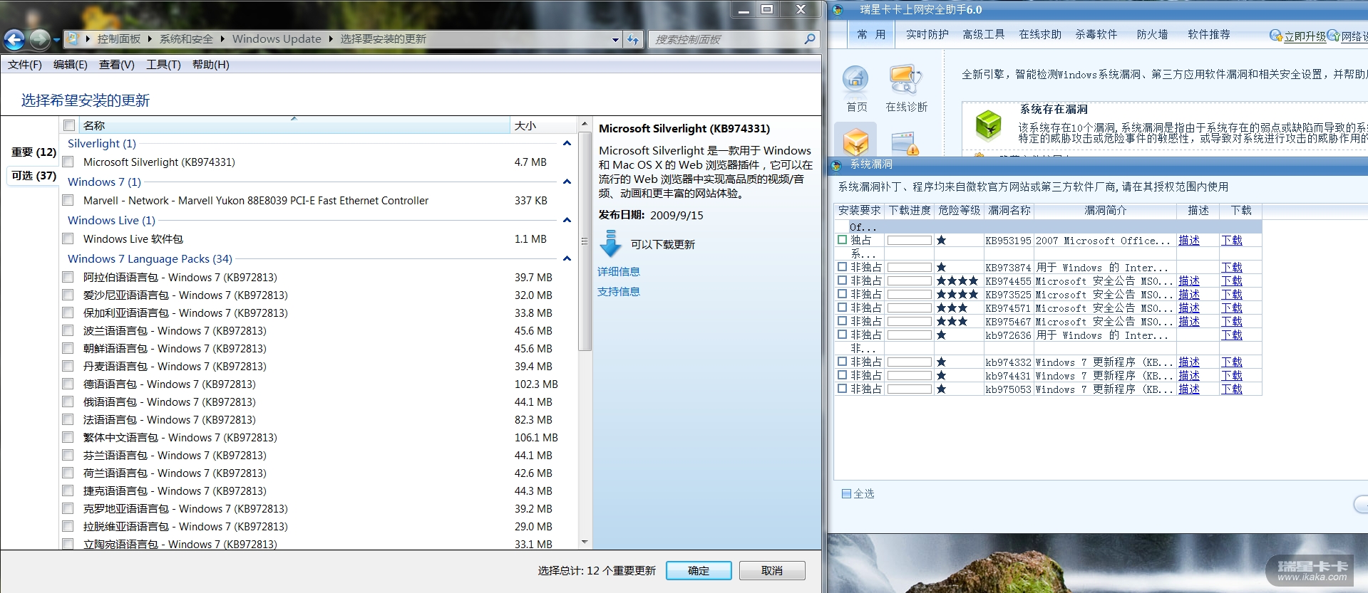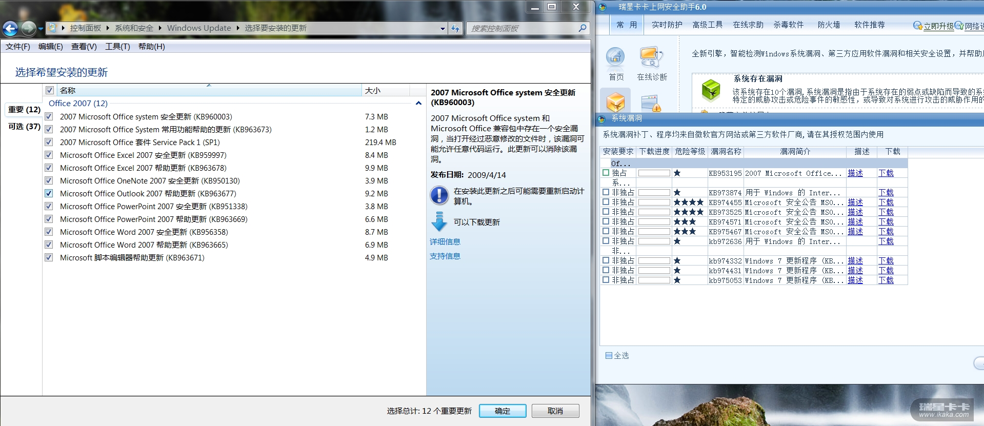 WINDOWS 7的 WINDOWS UPDATE与卡卡助手漏洞扫描的比较