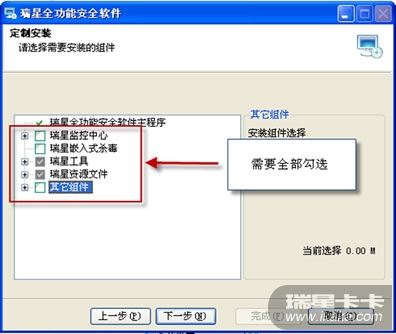 4)确认勾选完毕后,点击【下一步】,然后按照软件提示完成操作。并尝试升级瑞星软件,并查看问题是否得到解决。