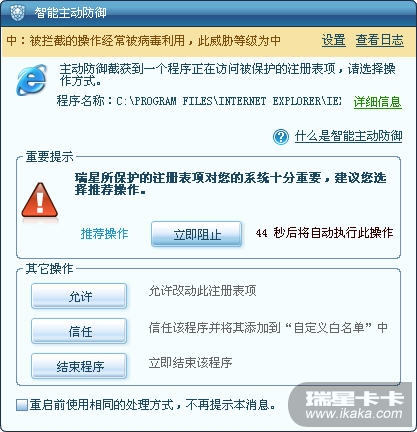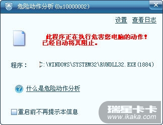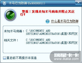 瑞星默认出厂设置是家庭模式,此时的木马行为防御以及危险动作分析提示框如下
