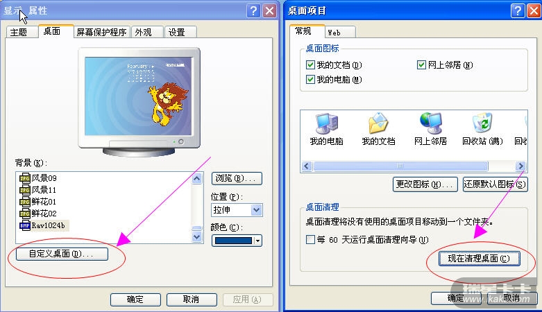 如果在自定义桌面里没有“清理桌面了”(见图示)