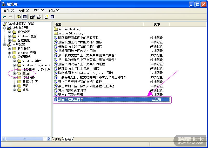 可以在计算机左下角的开始菜单----运行----gpedit.msc----点确定按钮,然后展开【用户配置】下的【管理模板】,点击【桌面】,然后双击【删除清理桌面向导】,选择在【禁用】上面,然后点【应用】、【确定】按钮,然后关闭组策略窗口,返回到之前提到的自定义桌面里进行清理安全上网主页。(见图示)