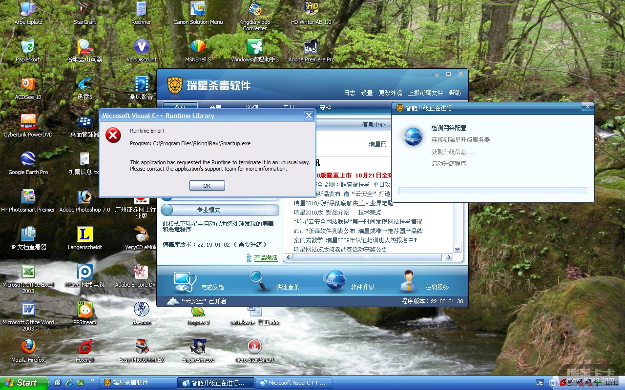 从10月25日自动升级到2010后就出现Microsoft C++ Runtime Error(杀毒软件和防火墙都是), 打电话联系了瑞星客服, 按照他的方法卸载了, 重装了,不选"保留用户配置文件", 试了N次, 还是不行.