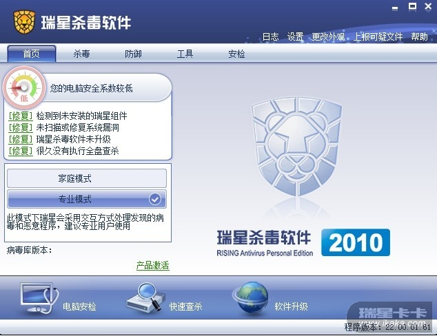 点击软件升级后没有任何反应,点击杀毒时先是卡了一会,接着就没反应了,左上角有四项需要修复的,点击修复也同样是没反应……
