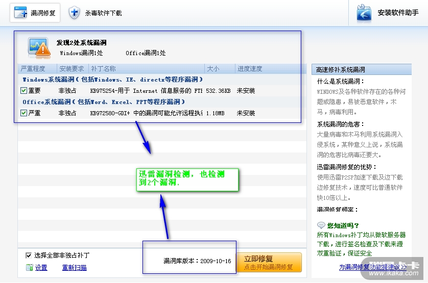 瑞星卡卡上网助手在漏洞扫描上感觉不如同类软件。我就此进行了对比: