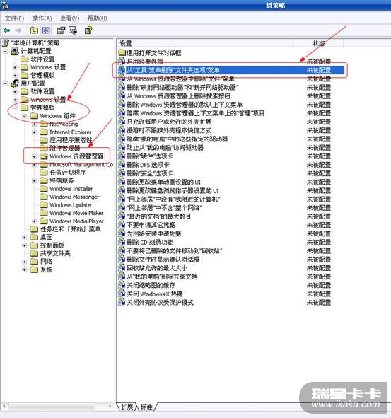5、双击gpedit.msc文件后会打开组策略的窗口,然后在组策略里展开【用户配置】、展开【管理模板】、展开【windows组件】、点击【windows资源管理器】、找到【从“工具菜单删除”文件夹选项菜单】。(见图示)