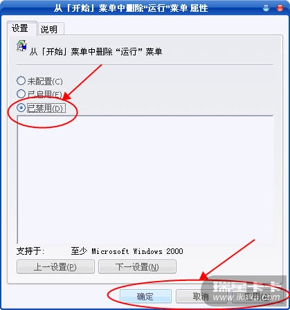 8、双击【从[开始]菜单中删除“运行”菜单】后,依次选择【已禁用】→【应用】→【确定】。(见图示)