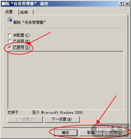 10、双击【删除“任务管理器”】后,依次选择【已禁用】→【应用】→【确定】。(见图示)