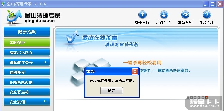 操作步骤:打开金山清理专家,点病毒木马防杀,点开始安装使用,就提示升级安装失败