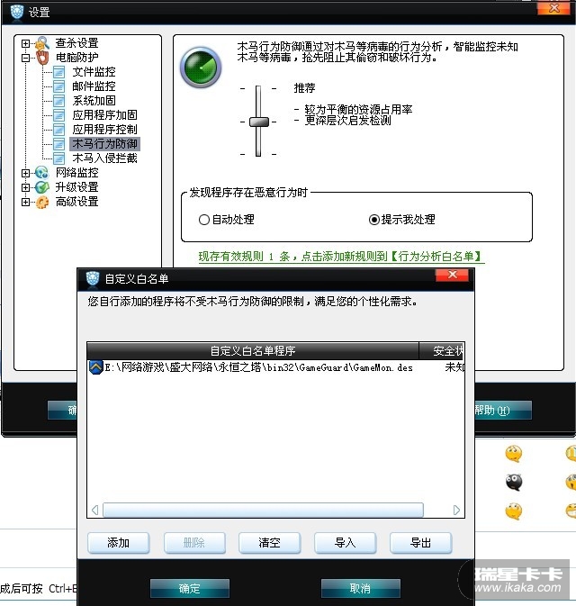 把游戏添加到木马行为防御选项里面的行为分析白名单里面就没事了我以前也有一个游戏遇到过这个情况的后来我把游戏添加到行为分析白名单里面就没事了