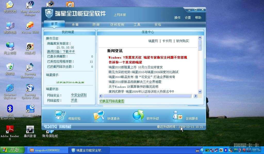 建议修复软件试试,开始—所有程序—瑞星—修复软件。现在有瑞星全功能2010上网本专用,搂主可以下载安装试试(安装前要把以前版本完全卸载)