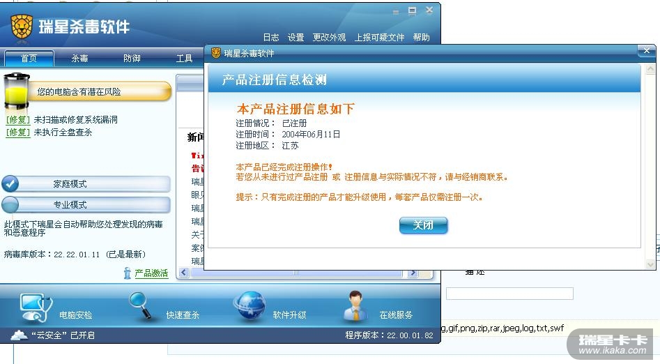 04年买的盒装的,后来10ris出来后只能分开用杀毒和墙,不能用ris,今天下了免费半年的ris,试着激活了下没想到竟然可以,不知道我这个04的号能让我用到什么时候,当时80块还是85块买的盒装正版。